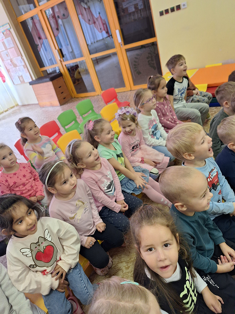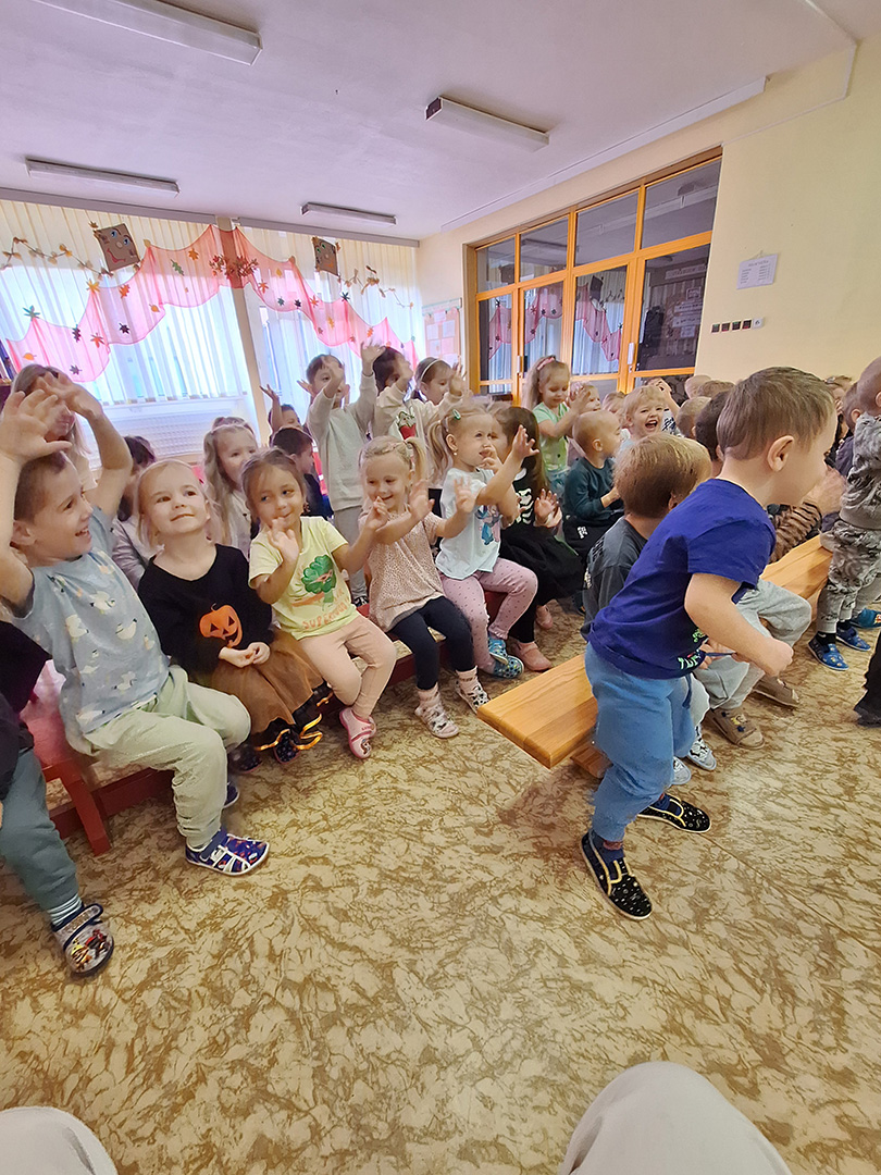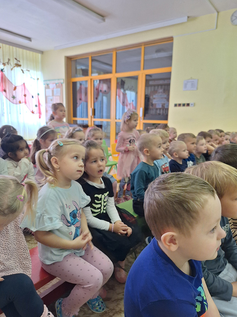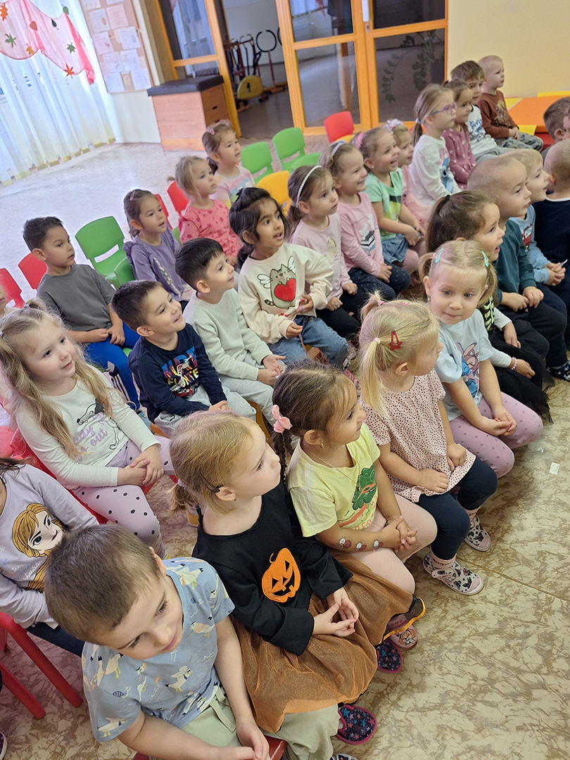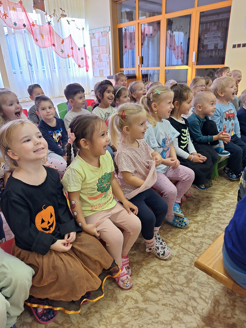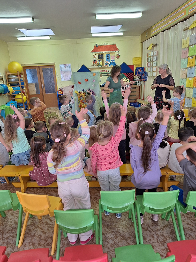 Dňa 15. 10. 2025 sme mali pre naše deti Divadlo Svetielko: "JESEŇ SPIEVA". Veselé a zaujímavé zvieratká, ktoré sa pripravujú na zimný spánok, ale aj odlietajú na jeseň do teplých krajín sa prihovárali deťom slovom, piesňou, aj pohybom.